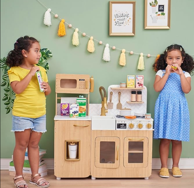 "This kitchen is absolutely adorable and the perfect size for my daughter. The faux marble countertop and gold accents make it look so stylish—like a mini version of my real kitchen! She loves cooking alongside me now. Great quality and easy to assemble."