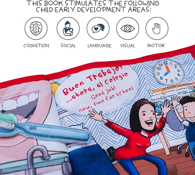 - ✓ BILINGUAL TEXTS - This is not a regular quiet book, actually, this one tells a story written in English and in Spanish, ideal for your children to learn or practice a second language. It is perfect for Spanish learning for toddlers. Made with soft fabric pages provide a fun texture and make learning to read fun for baby. VAMOS AL COLEGIO es el libro perfecto para que tu bebé aprenda Español como segunda lengua