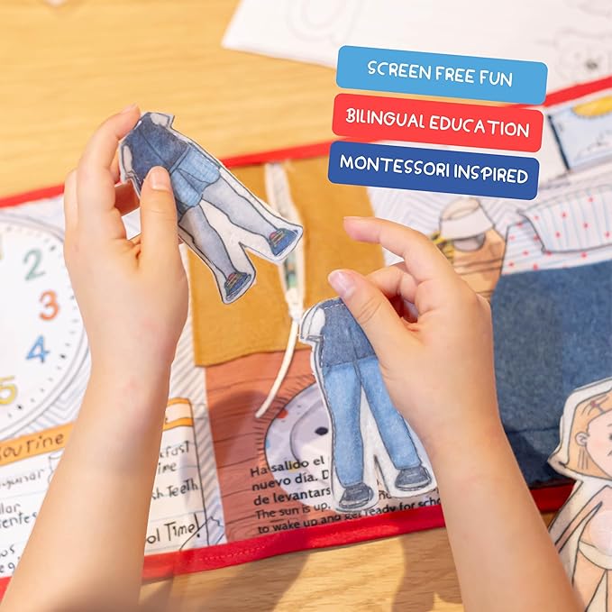Routines 11 Pages Quiet Book for 3+ Year Old Boys and Girls | Bilingual Soft Book | Preschool and Early Learning | Montessori Fabric Book for Toddlers | Play and Learn Toy | 14 Pieces Included.