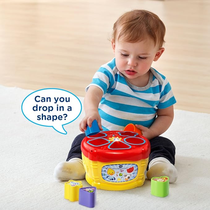 - Sort the shape blocks and drop them into the drum learning toy to build motor skills; open the top of the drum to dump the blocks out and start again