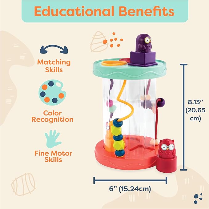 - Shape Sorting Toy: Have a hoot of a good time with this colorful shape sorter! Play all day with 3 hooting owls and 3 colorful bead mazes.