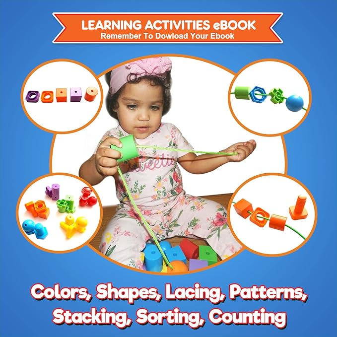 - WHAT’S INCLUDED | You will receive 12 jumbo beads in 4 shapes and 6 rainbow colors and 12 jumbo nuts and bolts in 4 shapes and 6 colors.You also will receive 2 lacing strings:1 for beginner lacers that features a thick threading tip and a knotted end so your beads do not fall off and a standard lacing cord to challenge your little one. After play, store the fine motor toys in the zippered storage tote and off you go!.Also included is a digital download of our step by step activities ebook.