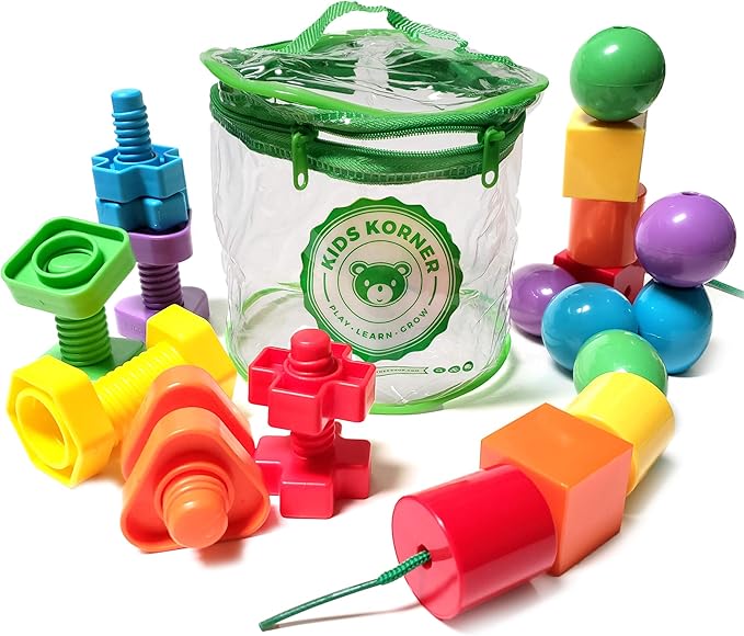 - TODDLER TRAVEL TOYS | The 2-in-1 educational toddler toys encourage quick clean up after play with included toy storage tote. Explore your world with these stringing beads and nuts & bolts toddler girl toys and toddler boy toys. The Montessori toys are great travel toys for toddlers and airplane activities for kids by Kids Korner Toys.