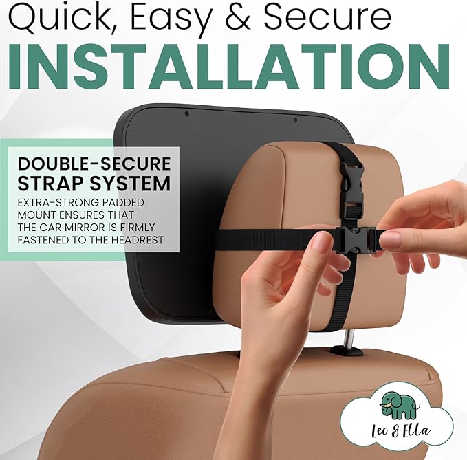- âš¡ EASY, NO-HASSLE INSTALLATION - Skip the frustration! Our infant car mirror for back seat rear facing is fully assembled and secures in just 30 seconds to any adjustable headrest with double-strap fastenings.