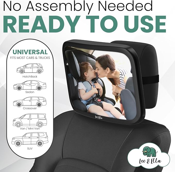Leo and Ella - Baby Car Mirror - Extra Large & Ultra Clear Infant View, Crash Tested Shatterproof Design w/ 360° Adjustable Mount, Premium Car Mirror For Baby