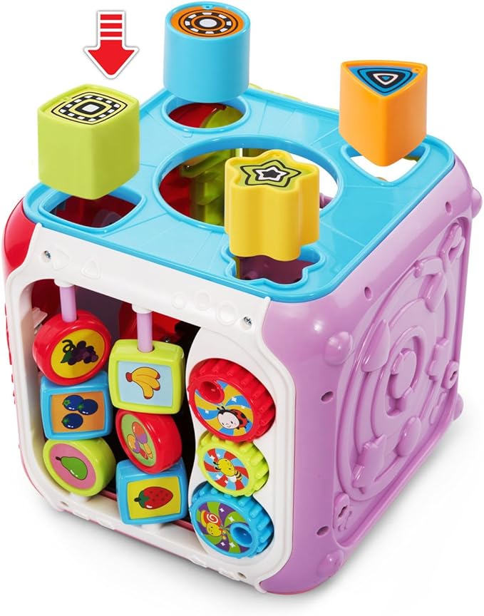 - The activity cube also develops hand-eye coordination with the shape sorter and colorful shape blocks; includes 4 colorful shape blocks