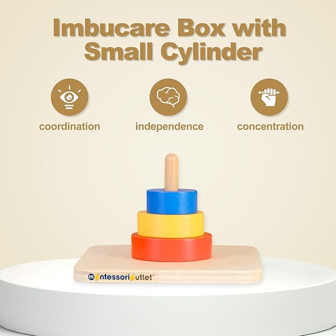 - Simple Operation: The child places the discs one after the other in the correct order with the largest disc at the base and the smallest disc on top. This exercise helps the child practice fine motor-skills, hand-eye coordination, the concept of order, as well as explore the use of their hand, and movements of the finger and wrist.