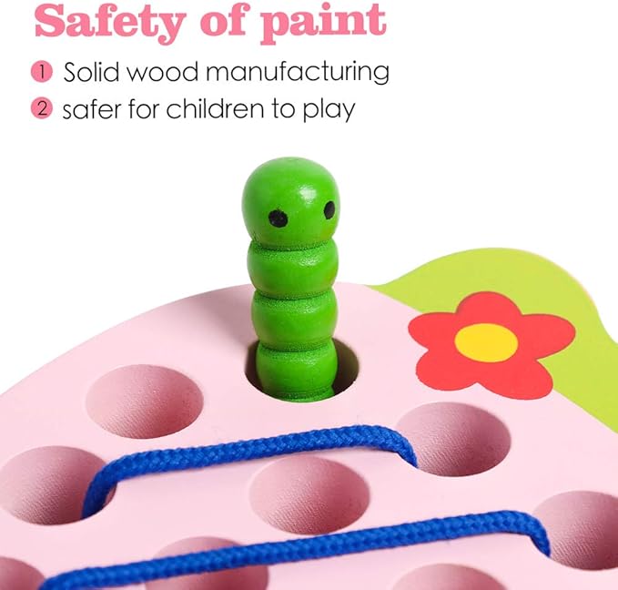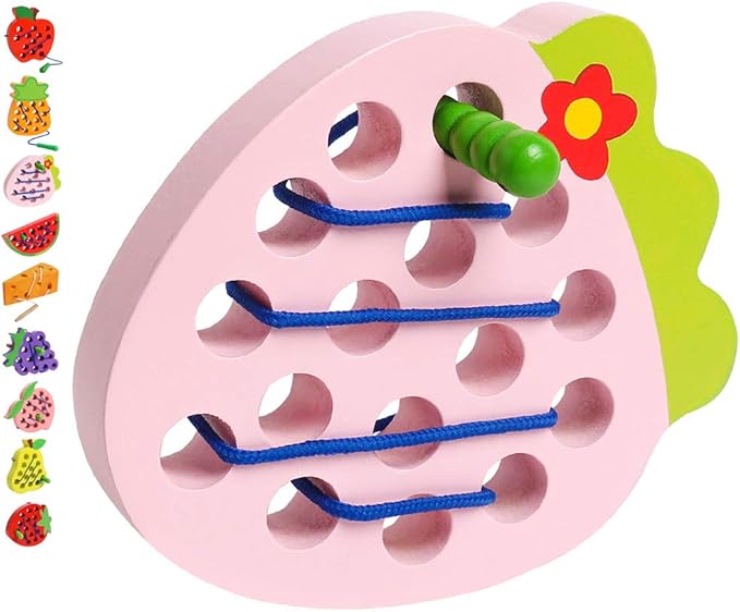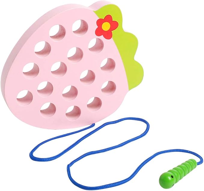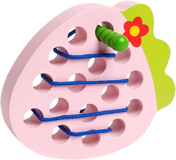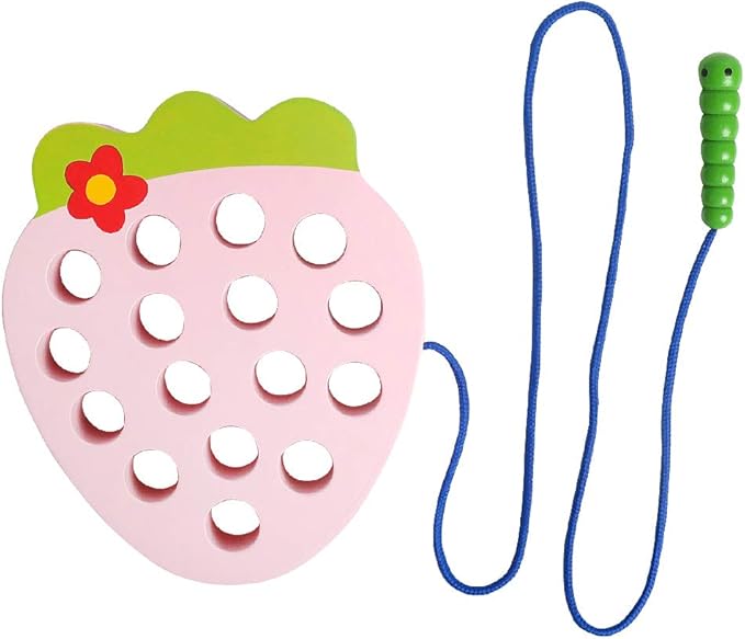 - FUN AND CREATIVE: The Wooden Lacing Strawberry Toy is a simple, vivid pink Strawberry with smooth holes and green leaf look so much delicious, let the hungry caterpillar eat it sooner. Help the string-attached caterpillar munches through the Strawberry by threading in and out. Perfect for training and developing personal skills.