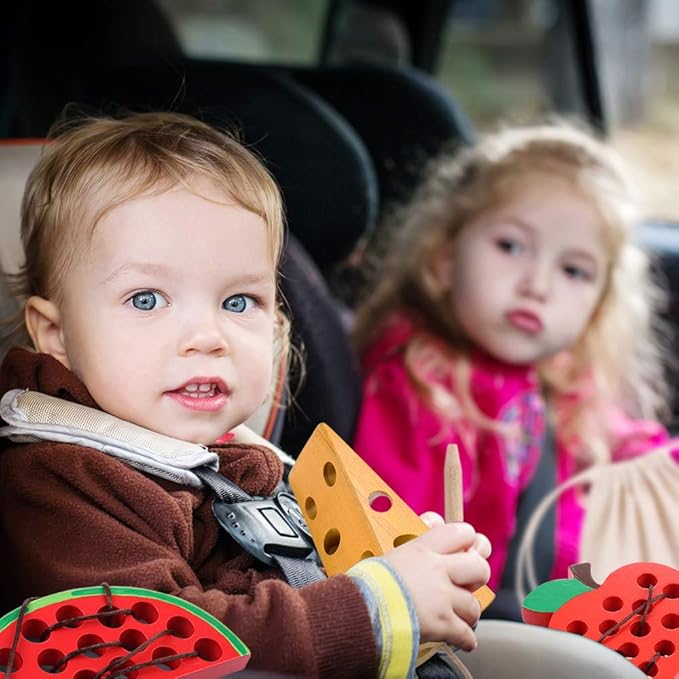 Lacing Toy for Toddlers, Fine Motor Skill Toys for 3 Year Old, Educational Learning Montessori Activity for Baby Kids, Car Plane Travel Games, Wooden Threading Toys 1 Apple,1 Watermelon, 1 Cheese.