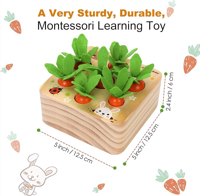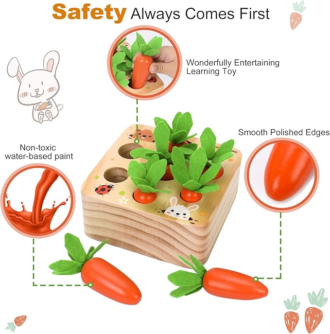 - Carrot About Learning – Harvest entertainment while planting the seeds of success. Challenge little gardeners to fit each colorful carrot into its correctly-sized hole with your carrot toy puzzle!