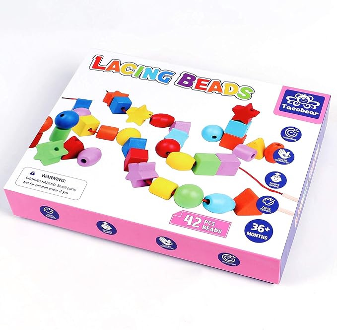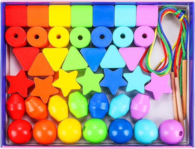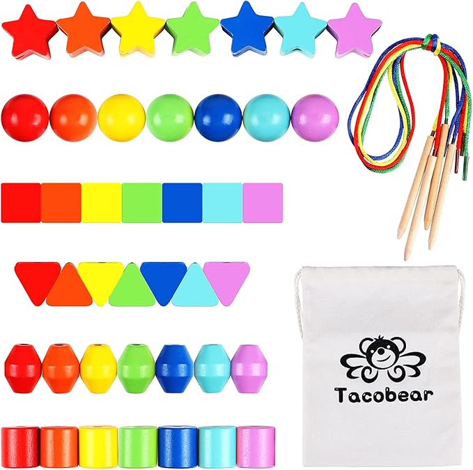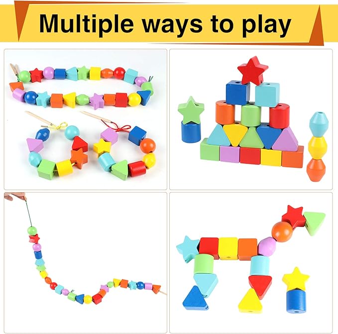 - 【MULTIPLE WAYS TO PLAY】---Sort the beads, stack the beads, thread the beads onto the string; Montessori toy set is an ideal toy for boys and girls to stack and lace; The wooden stick on the string makes it easy for toddlers to lace beads; Beautiful wooden beads make for great play toys both while building and threading