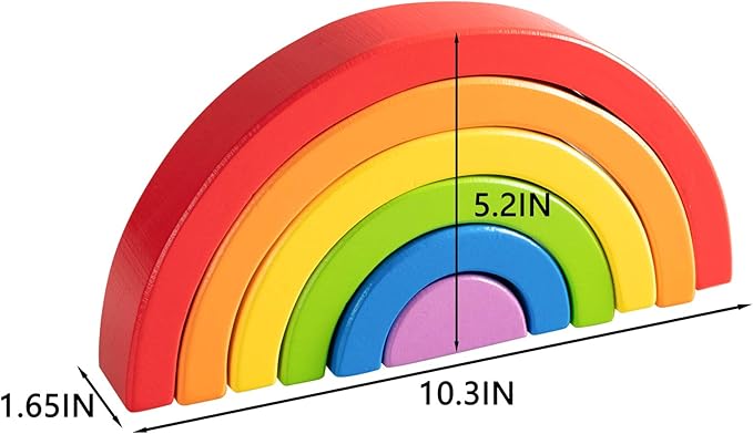 - Wooden Rainbow Stacking Toy: 6 pieces nesting together measure 10.3" wide x 5.2" high x 1.65" thick. Applicable age: 18 Months +