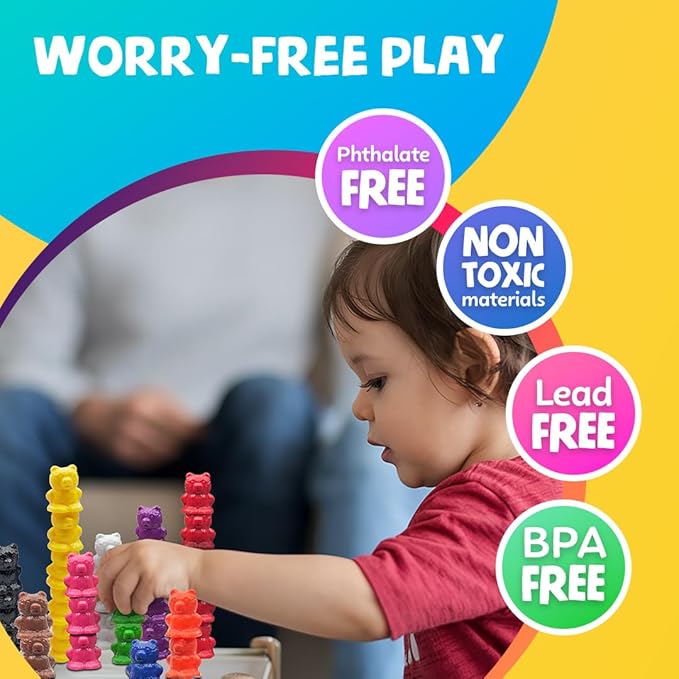 - SCHOOL READINESS: The tumbling counting bears for toddlers can be used to learn colors, sort, and stack. Preschoolers can use these teddy bear counters for EARLY STEM ACTIVITIES to learn basic math skills including graphing, addition, subtraction, skip counting, nonstandard measurements, one-to-one correspondence, counting to 60, comparison, making 10, sequencing, matching, patterning and grouping.