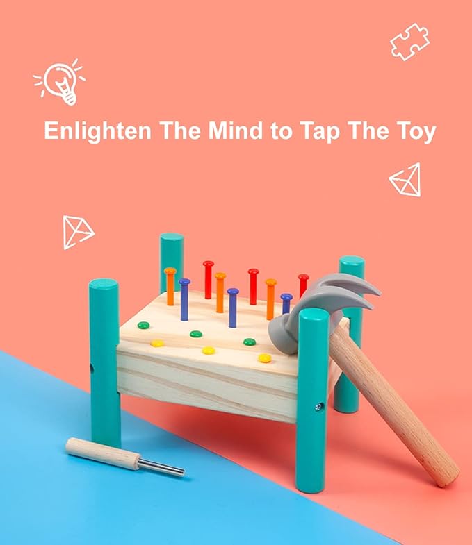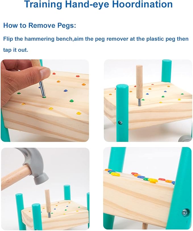 - 【WAY OF PLAYING】Hammering is fun! This toy is double sided,Insert the plastic pegs into the holes of the hammering bench then tap it with a hammer.Flip the hammering bench,aim the pegs remover at the plastic pegs then tap it out and start again, it’s that easy and real.Your little one will have hours of fun playing with this hammering toy.