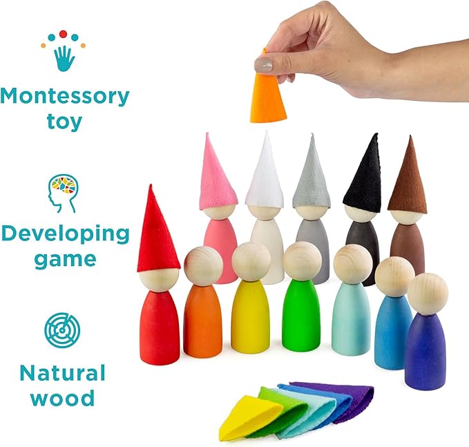 - π INCLUDED: 12 colored wooden peg dolls 3.35 in; 12 felt sorting hats; a wooden tray to keep all in place in your Montessori room; Combines with our sorters with cups and balls, spoons, smaller Montessori dolls, building blocks, and others