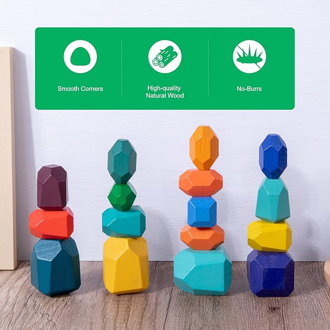 - NATURAL WOOD:The balancing stone blocks is made of natural wood polished at 360°, smooth and delicate surface without burrs, and will not harm your baby's hands and skin