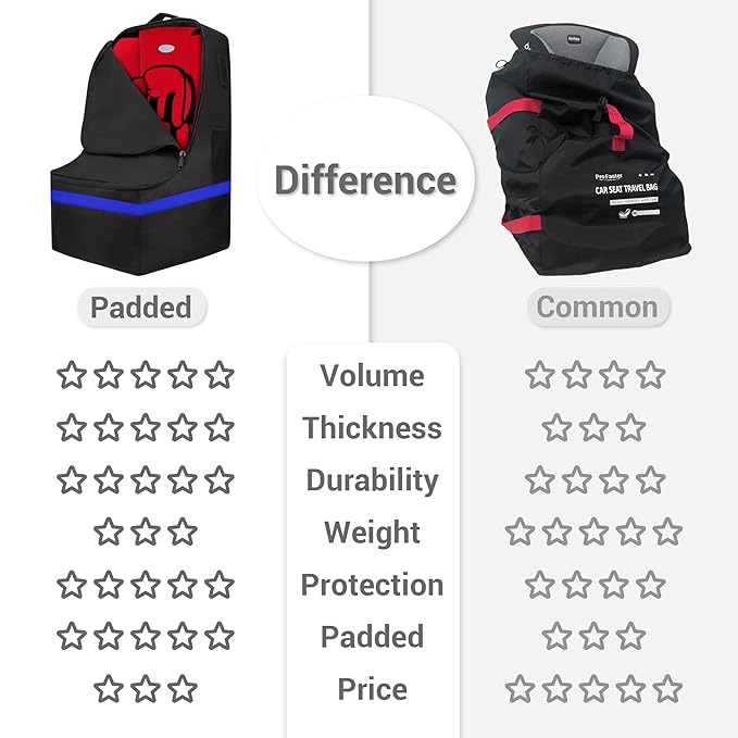 - Superior Material: ProFaster padded carseat travel bag is made of durable Oxford polyester with double-stitched, which is Water-Resistance, tear-resistant, light weight and strong enough for long-term use. Never worry about the safety of your experience carseat.