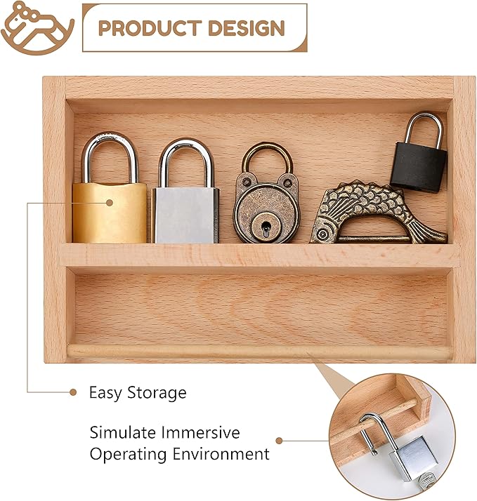- Unique Montessori Lock Toy - Well-designed wooden tray base, enough space to accommodate locks and keys, providing a simulated locking and unlocking scene, which newest design not only can helps kids learn how to lock but also how to unlock by different lock of shape and functions. Great toy for kids to improve their hand-on ability and fine motors skills
