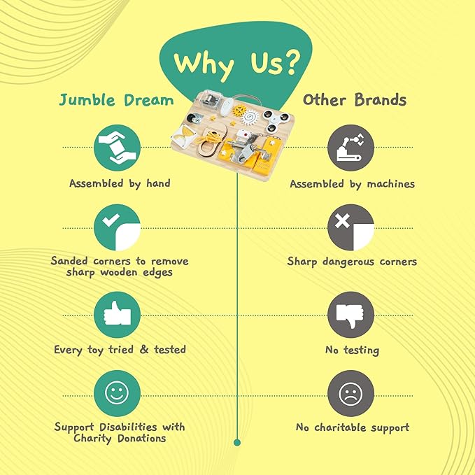- Built to Last: Experience durability and premium quality like never before with our busy board for 1 year olds and above! Jumble Dream Montessori toys are built to last, with sturdy construction, sanded smooth edges and high-quality materials that ensure safe and long-lasting toddler play.