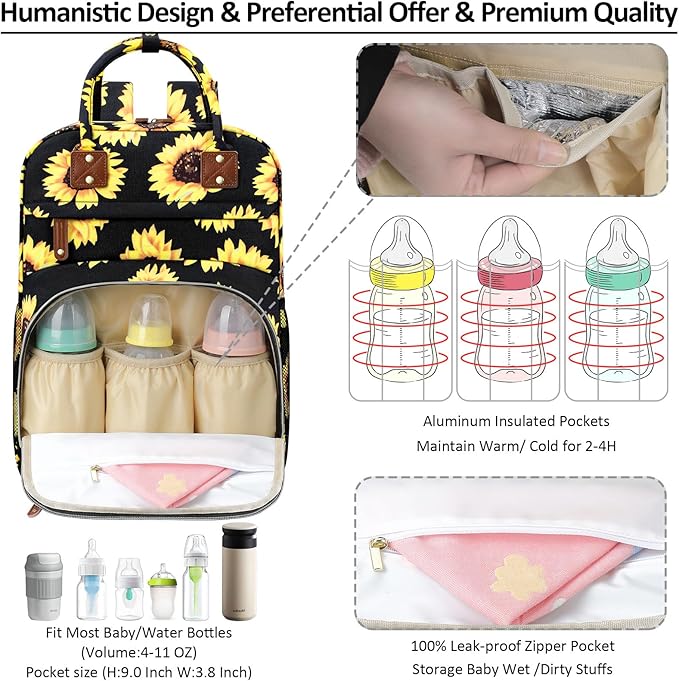 Diaper Backpack Tote Large Capacity, Baby Bag with Insulated Pockets Multifunctional Diaper Bags For Baby Girl Boy Women Waterproof Bags Mama Maternity Bag Sunflower