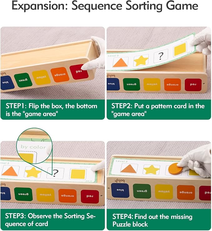 - The Sorting Box designed and production-supervised by AMI Teacher (Association Montessori International), which helps kids develop multiple skills such as fine motor skills, hand-eye coordination, matching, sorting, counting, problem solving, imagination, protect their concentration and inspiring confidence through play.
