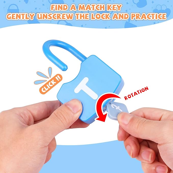 - 26 LOCKS ANS 26 KEYS SET - Our educational preschool toys set includes 26 locks and 26 keys. The locks are adorned with uppercase letters on front and cute cartoon shapes on back while the fronts and backs of the keys are uppercase and lowercase letters. Match the keys with capital letters or locked pictures to unlock the lock and give your child a sense of pride!