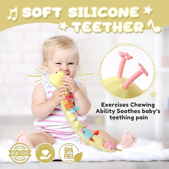 - Sensory Learning Toys - The body part of the baby caterpillar toy has 3 different sensory designs - crinkle, rattle and bell. Each has a different texture and sound. Baby's eyes and hands will focus on these design as they explore. It helps baby develop fine motor skills and auditory development.