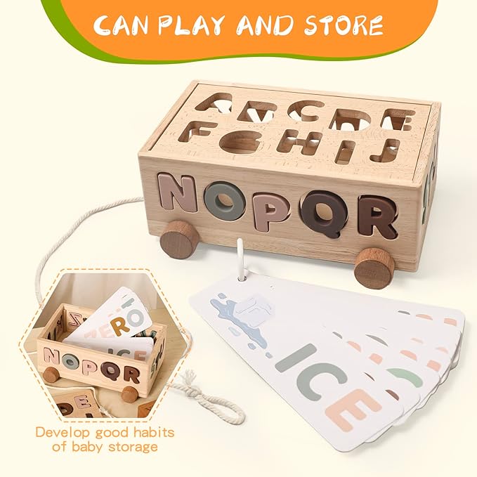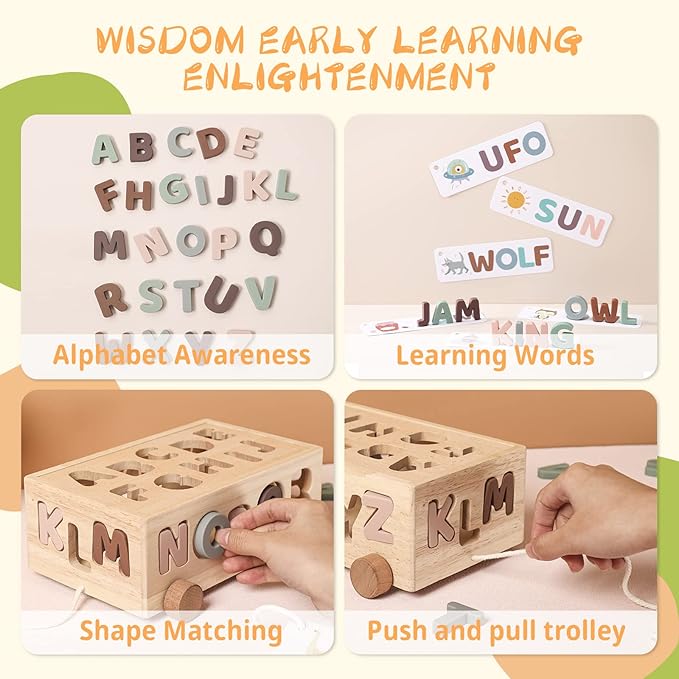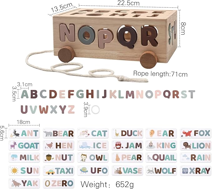 - 🚗Sturdy Montessori Wooden Toys:Our toddler toys made of high-quality wood.This shape sorting toy for toddle contains 26 silicone letters, 26 word cards, a wooden cart with a traction rope. Non-toxic and burr-free, polished edges, smooth and flat.So kids toys can be used for a long time.