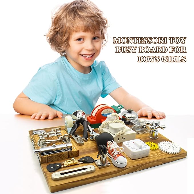 - [Durable & Safe Wooden Material] This wooden Montessori busy board is made of smooth & durable wooden materials, smooth edges and surface make it safe enough for your kids, no worrying about any hurt.Good motor skills toys for toddlers 3+, especially for autistic children.