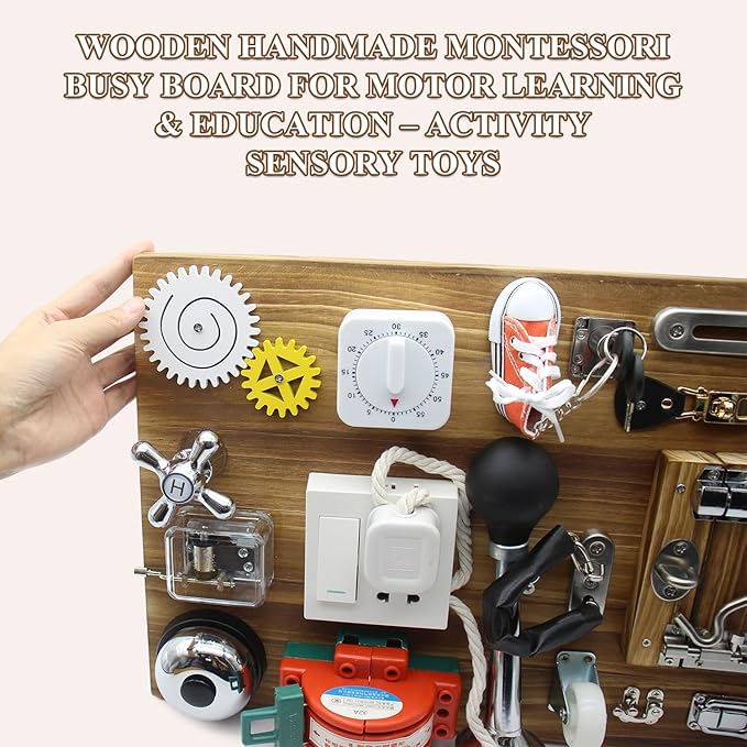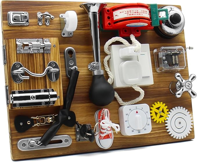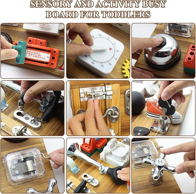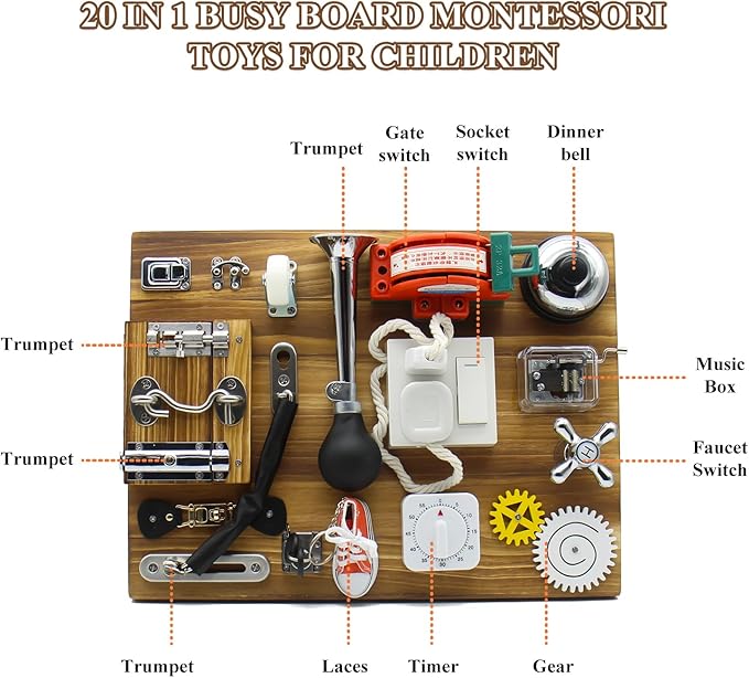 - [21 in 1 Large Wooden Busy Board] This wooden busy board is designed with trumpets, timer, dinner bell, key lock, faucet switch, shoe, manual music box, gear and so on 21 daily supplies functions,which can keep your kids busy for travel and improve motor skills.