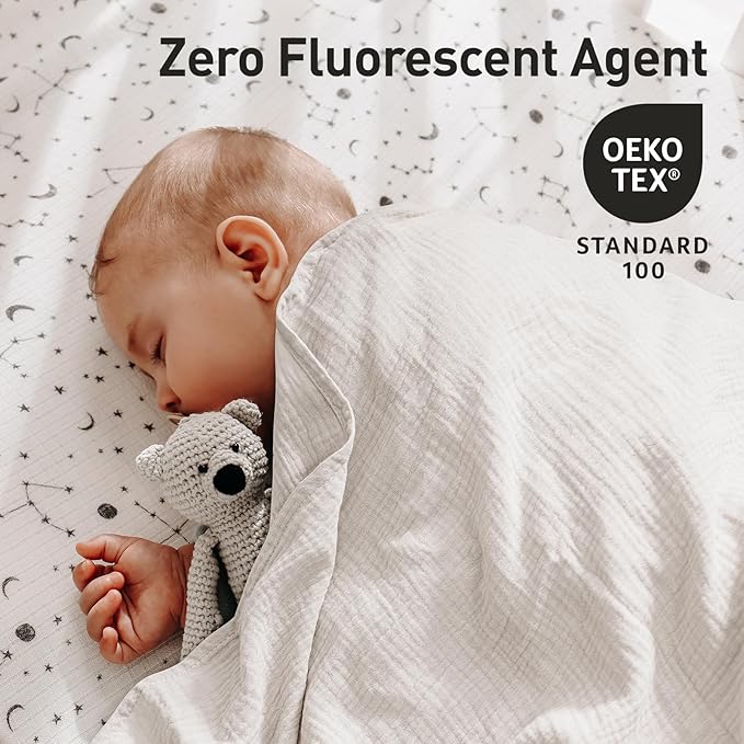 - SUITABLE SIZE: All of our products have passed the OEKO-TEX STANDARD 100 certification.Our muslin baby blanket measures 38'' x 40''(95 x 100 cm; material is approximately ± 1 inch), which is large enough to easily wrap or swaddle babies from startling themselves awake with random arm movements, recreates the secure and cozy feeling of the womb, helping soothe your baby and enabling them to sleep better