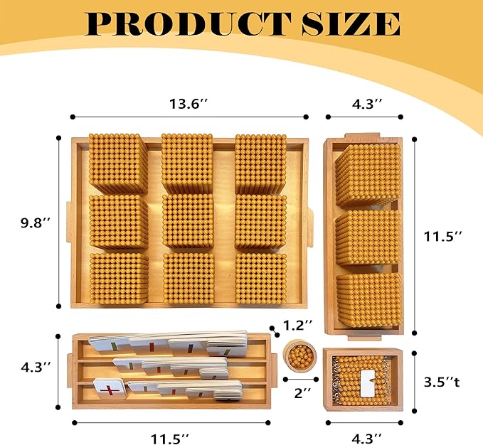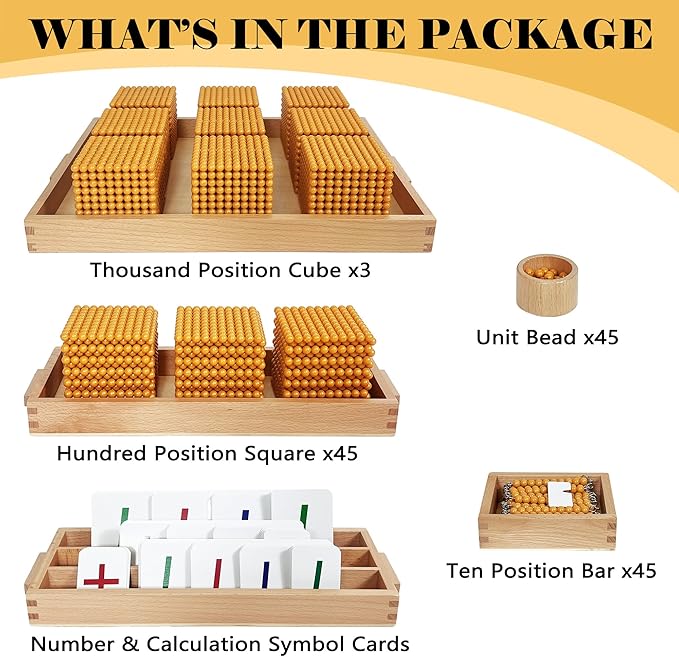 - 【Package Essential Elements】45 of unit beads. 45 of ten position bars. 45 of hundred position squares. 9 of thousand position cubes. 1 set of operator cards. 1 set of 1-9000 large cards. 2 sets of 1-9000 small cards. 5 wooden storage trays.