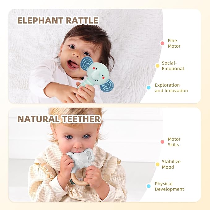 - EXERCISING HANDS-ON ABILITY AND RELIEVING TEETHING SYMPTOMS:The Spinning Drum Baby Toy soothes and helps develop hands-on skills with its rotation and sounds. The Teether alleviates teething pain with its unique shape and texture, while the Elephant Rattle Toy encourages swinging and hand exercise with its cute design and sound.