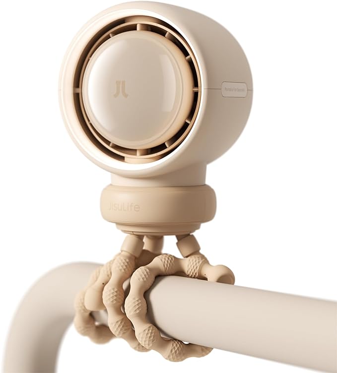 JISULIFE Stroller Fan Baby Large, Safe Bladeless for Crib, Desk, 4000mAh Battery Rechargeable Portable Cooling Fan with Air Turbo Tech, Night Light, Food-Grade Gift for Mom/Dad/Friend - Brown