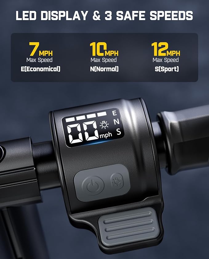 - Three-speed modes: This scooter offers three user-selectable speed modes (E, N, S) . The E gear provides with a speed limit of 7MPH; the N gear offers with a speed limit of 10MPH, and the S gear , boasting speed of 12MPH