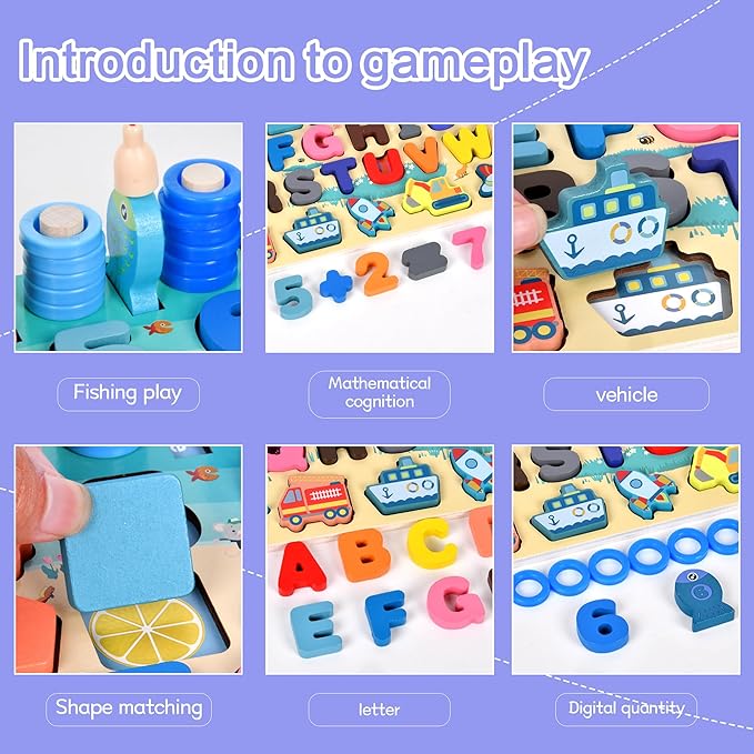 - This shape number fishing game board, which has interesting animals and animal images, colorful cars, small fruits, develops young children's color, shape, number recognition, hand-eye coordination, encourages creativity and imagination, fine motor skills, math counting skills, and is an ideal toy for young children's preschool learning.