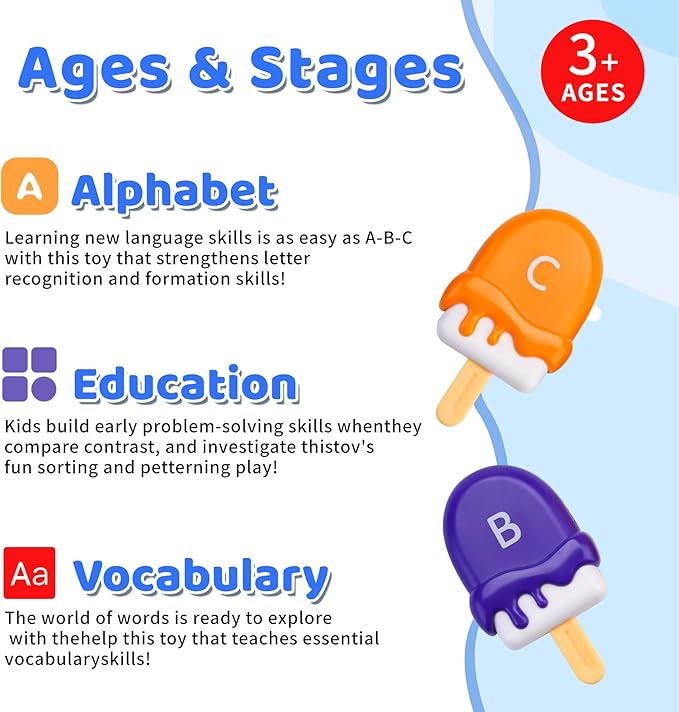 - Alphabet Learning Toys Games:Inspire toddlers aged 2-4 to explore early letters A-Z with this creative ice cream alphabet toy.Each alphabet toys features an uppercase letter and matching illustrated vocabulary inside,combine the joy of learning letters with color recognition,it sparks curiosity while teaching early educational concepts.