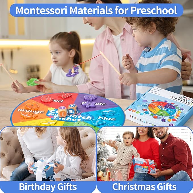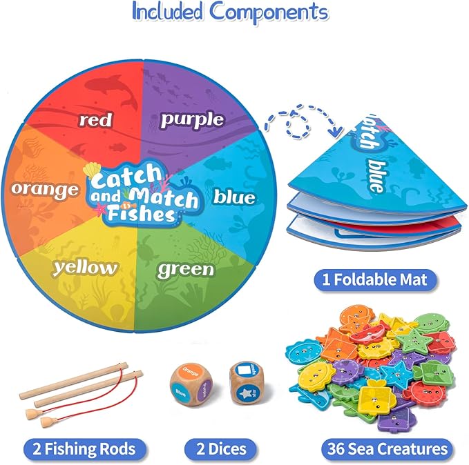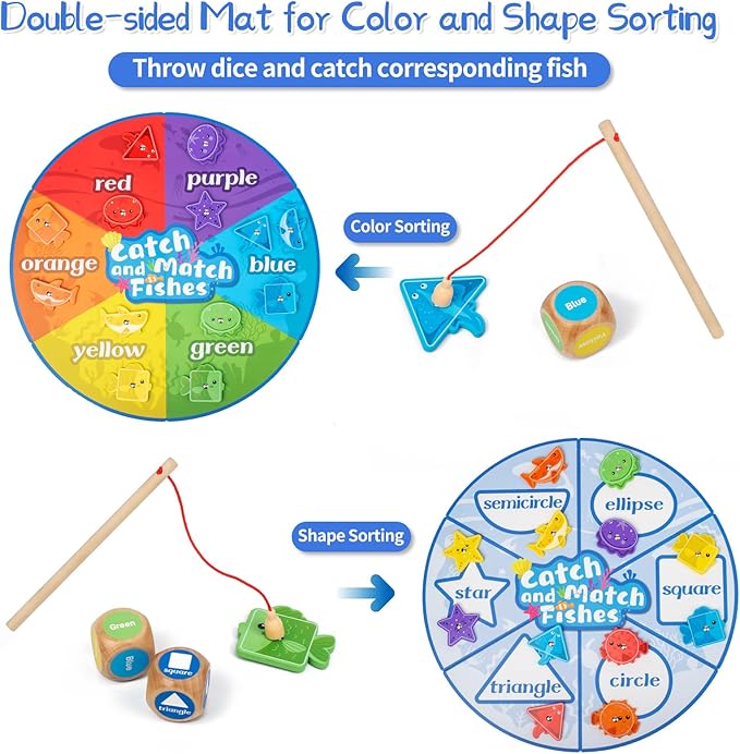 - 【Compact and Portable Package】You will receive 1 foldable double-side mat, 36pcs wooden fishes in 6 different colors and shapes, 2 fishing poles and 2 dices. The design of fish shapes are vivid and in bright color, which would easily attract kids interest. All pieces can be packed in the giftable box.