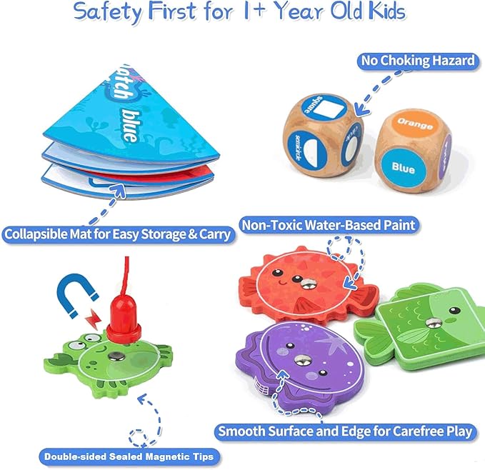 - 【Premium Quality】The wooden fish uses high-quality double-sided sealed magnets, which are safer and easier to adsorb. In addition, the round floor mat is flat, can be folded and stored smoothly, making it easier to catch and match fish, giving children a better gaming experience!