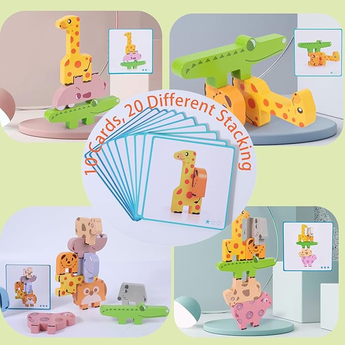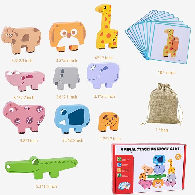 - Montessori Animal Blocks Set: This wooden sorting & stacking includes 10pcs blocks, such as giraffe, crocodile, hippo, elephant, sheep, puppy, cow, mouse and rhino. 10pcs double-sided challenge cards and 1pcs storage bag