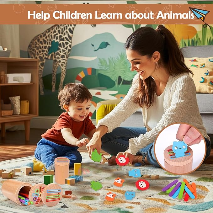 - What you get: 1pc montessori toys with 2 lids, 10pcs wood sticks , 10pcs Ice cream stick and 8pcs animals coin. Our Montessori toys also come with a canvas drawstring bag so you can take toys on the go