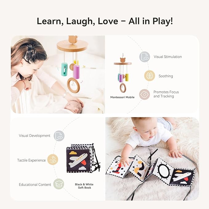 IEATFO Montessori Toys for Babies 0-6 Months, 6-in-1 Newborn Tummy Time Playful Learning Toys with Mobile, Black & White Soft Book, Spinning Rainbow Drum and Rolling Bell, Teether Rattle and More
