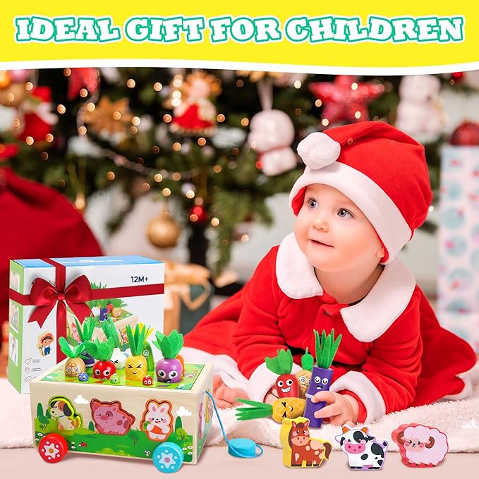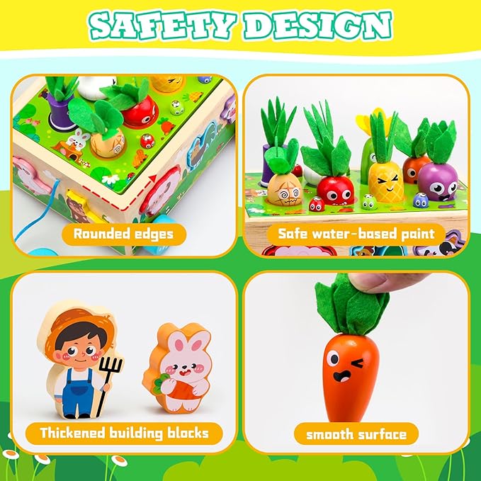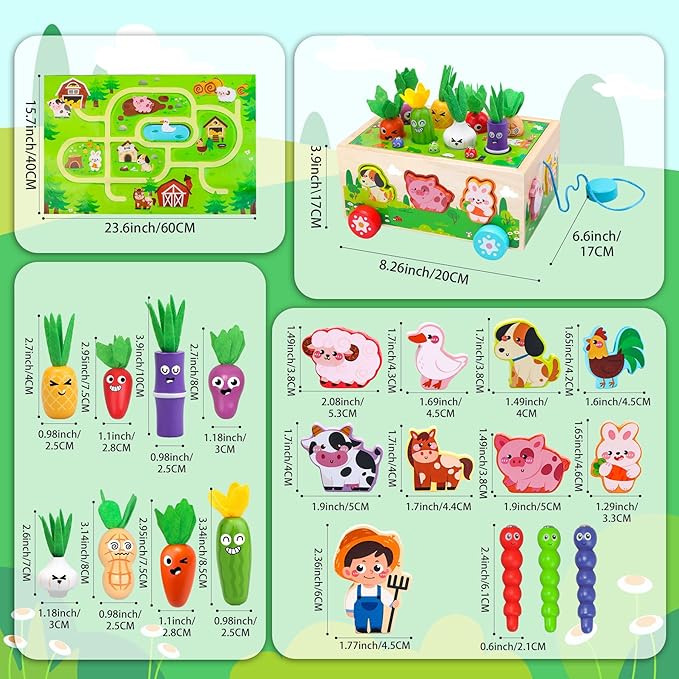 - Montessori Toys for 1+ Year Old: The delightful wooden farm toy features an array of engaging games. Toddlers can have a great time pulling vegetables, using the boy farmer to catch worms, placing vegetables in their corresponding color-coded positions, matching animal shapes, playing exciting map games, spinning gears, and pulling the wooden toy. These activities will not only challenge your child but also provide long-lasting entertainment
