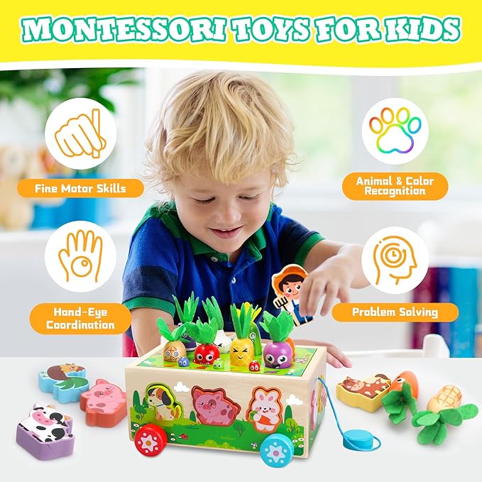 - Wooden Montessori Toys for 1 Year Old: The montessori carrot toy for toddlers in the 1-3 age range offer abundant fun through various games. These include shape sorting, fishing for worms, pulling vegetables, and spinning gears. Such activities are crucial for developing fine motor skills, hand-eye coordination, color recognition, and animal identification. Our educational toys for toddlers combine learning with enjoyment, keeping them entertained for hours on end without losing their interest