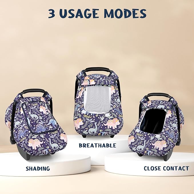 Pea Pod Car Seat Cover Baby, Infant Car Seat Canopy Covers for Newborn with 2 Layers Windows of Breathable Mesh Fabric, Lightweight Polyester/Soft Minky Dot Backing (Dinosaur)