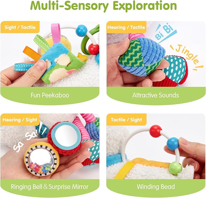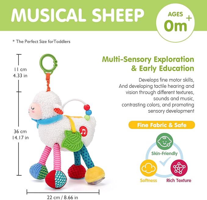 - All-in-One Sensory Experience for Early Development : From 0 months onward, this plush musical sheep offers an all-in-one sensory playground: soft plush textures, crinkly ears, gentle rattles, peekaboo flaps, a baby-safe mirror, and 4 melodies to help soothe or entertain your Baby. These features are thoughtfully designed to engage baby’s touch, hearing, and vision—boosting sensory awareness, early language skills, and brain development in a fun and gentle way