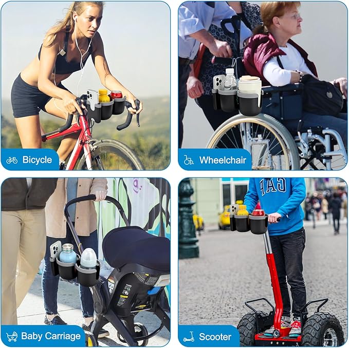 - Wide Compatibility: This universal cup holder with phone holder compatible with most baby strollers, walker, wheelchair, rollator, bike, scooter, boat handle bar, shopping cart, kayak, ATV, lawnmowers, motorcycle, treadmill, golf push cart and so on.