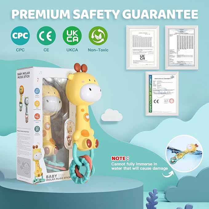 - FOOD GRADE SILICONE: The animal ears and bottom teether are soft, safe, non-toxic. The teething of rattles can be soaked in hot water for sterilization and cleaning. Be careful not to let the battery get into water
