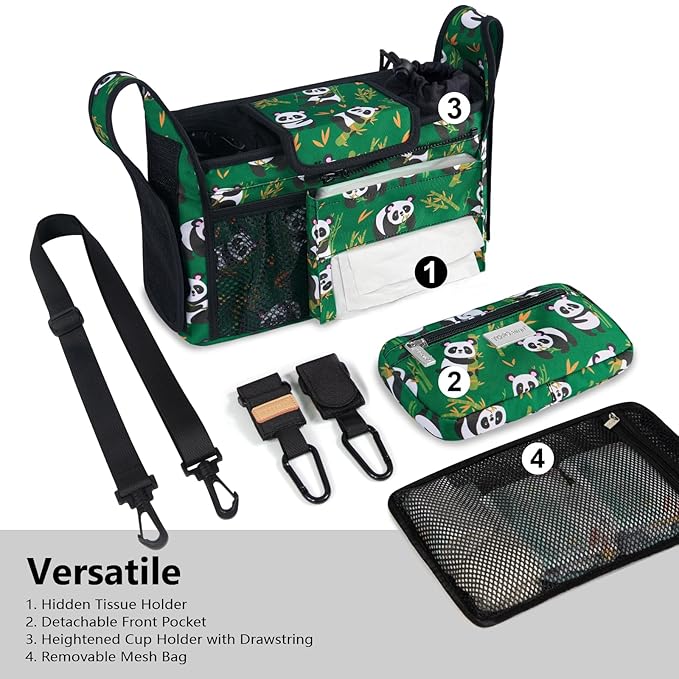 TOPDesign Universal Baby Stroller Organizer, Stroller Caddy with Detachable Mesh Bag & Heightened Insulated Cup Holders & Non-Slip Secure Hooks Accessories, Fits Most Strollers (Pandas)