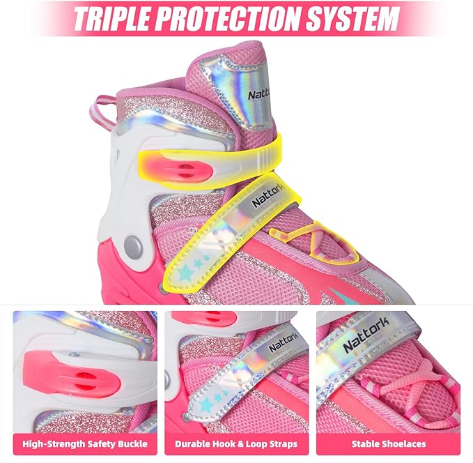- PERFECT BIRTHDAY/CHRISTMAS GIFT: Nattork inline skates can be a perfect birthday/Christmas gift for your kids, grandchild or nieces and nephews. The kids will have a happy childhood and great gifts. Affordable for beginners, we aim to provide a high quality experience. Suitable for over 4 years old children